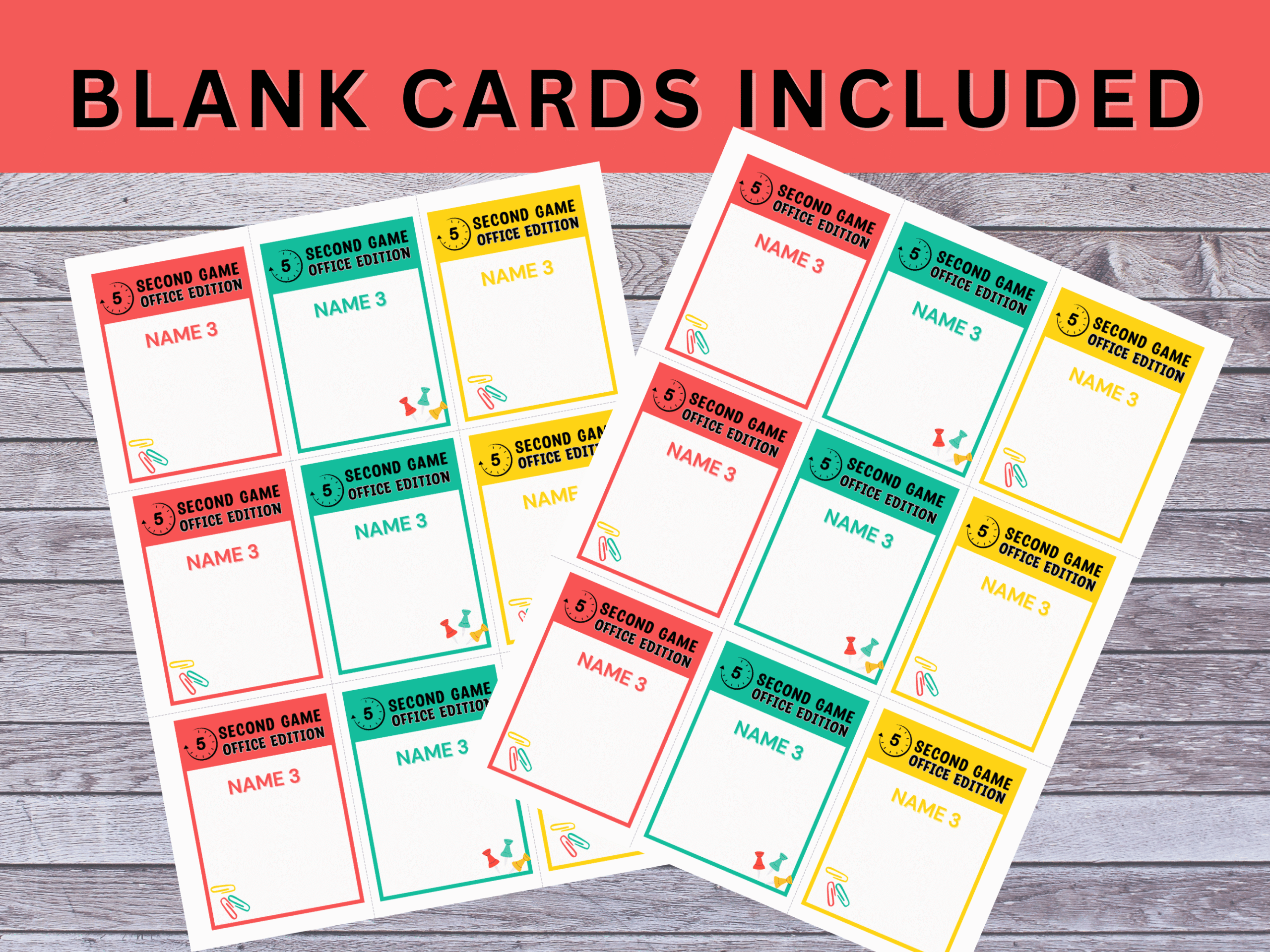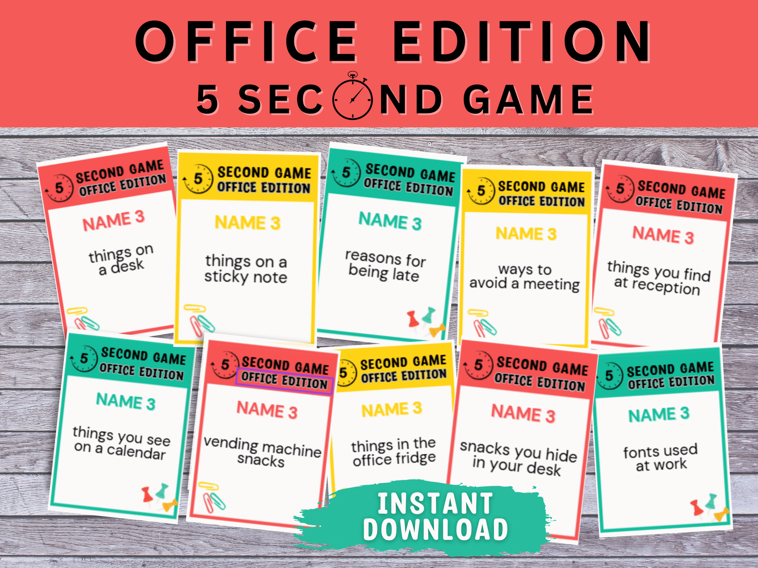 Kickstart your office event with this Office Edition 5 Sec Game Printable! Players must name three work-related items in five seconds — ideal for team building, staff parties, meetings, retreats, and corporate events. A quick and interactive way to energize any group.
