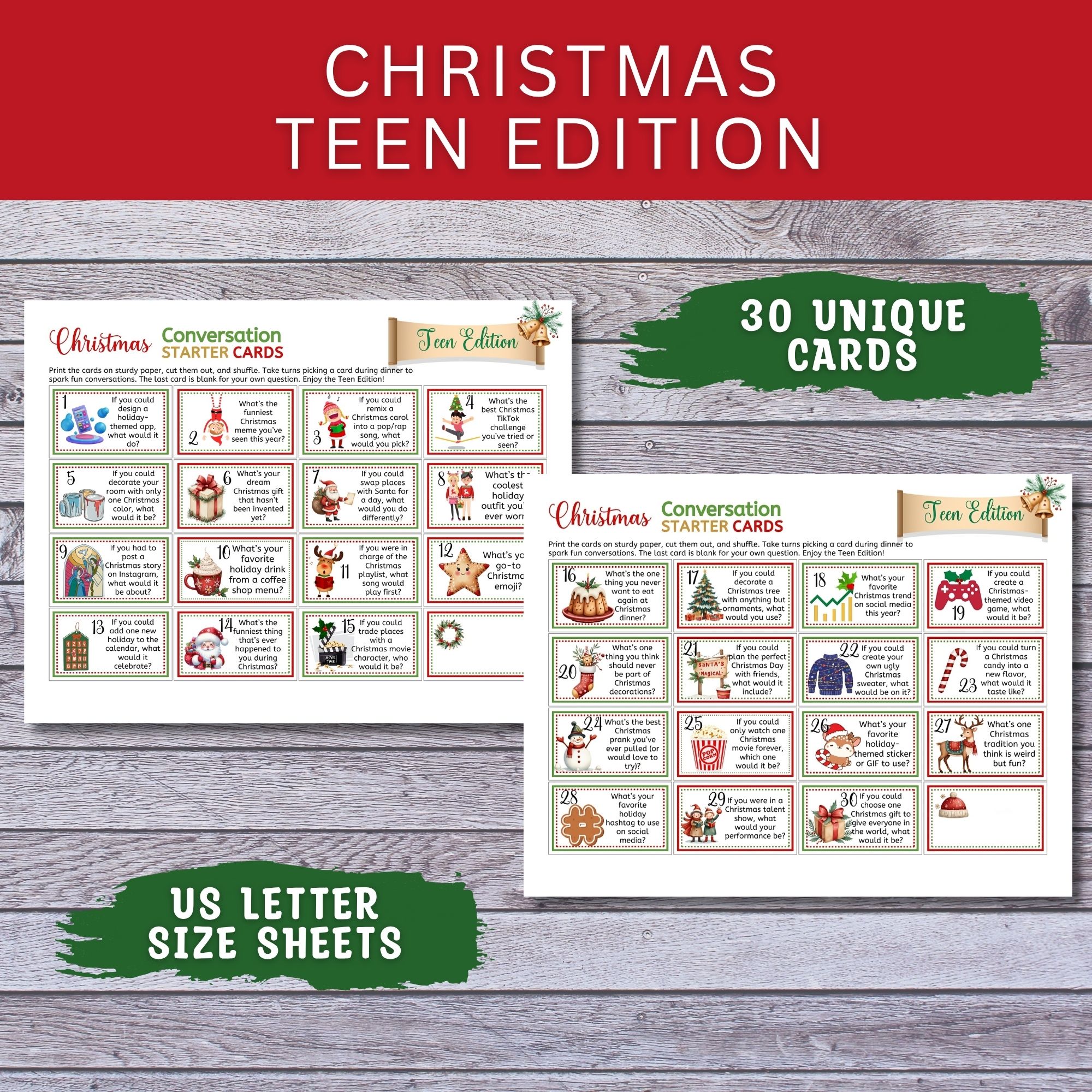 Spark laughter and fun at your Christmas dinner with these printable conversation starters for teens! Perfect for family gatherings, classroom parties, and holiday meals. Includes thought-provoking and funny questions to get everyone talking. Easy to print and use at your Christmas table or party.