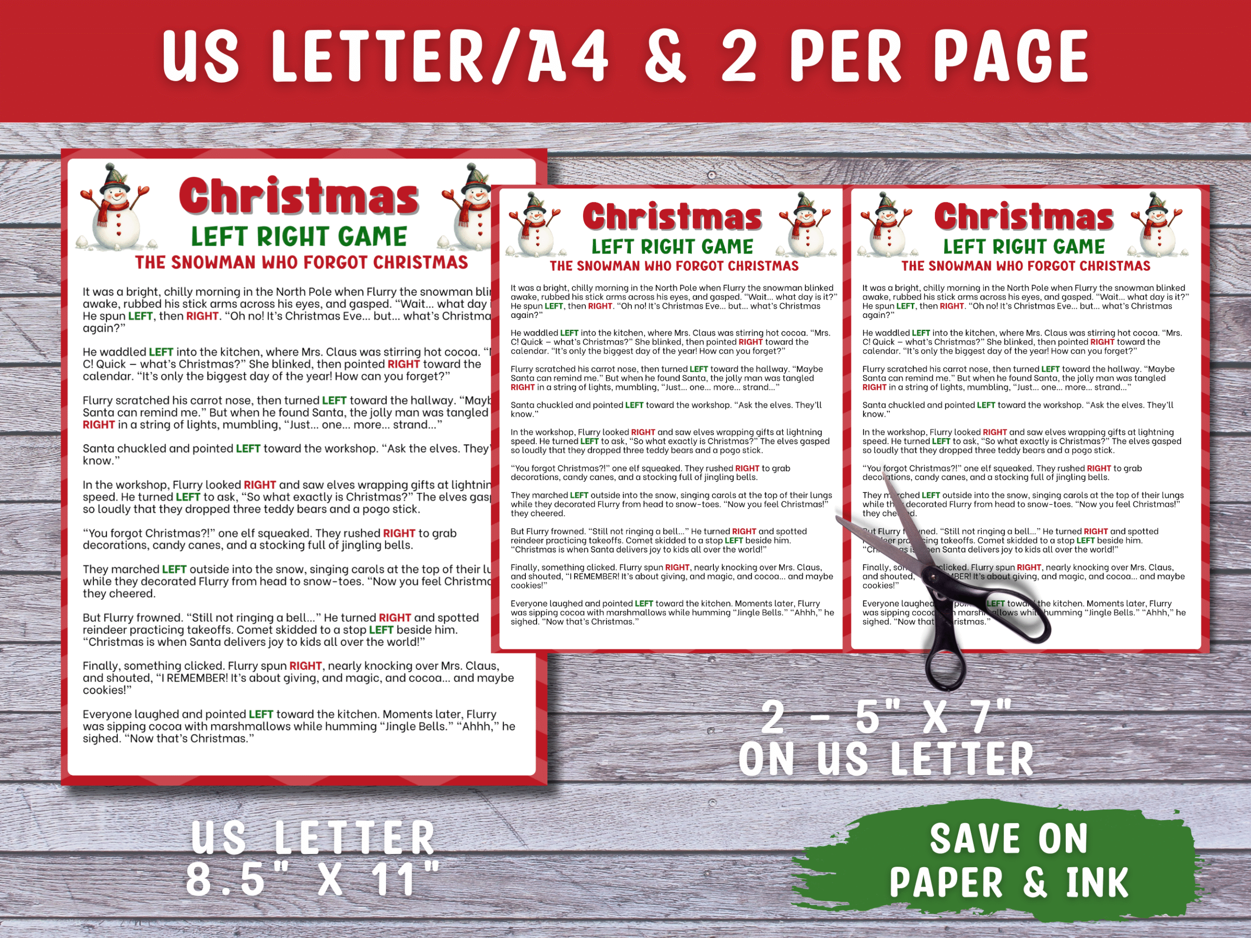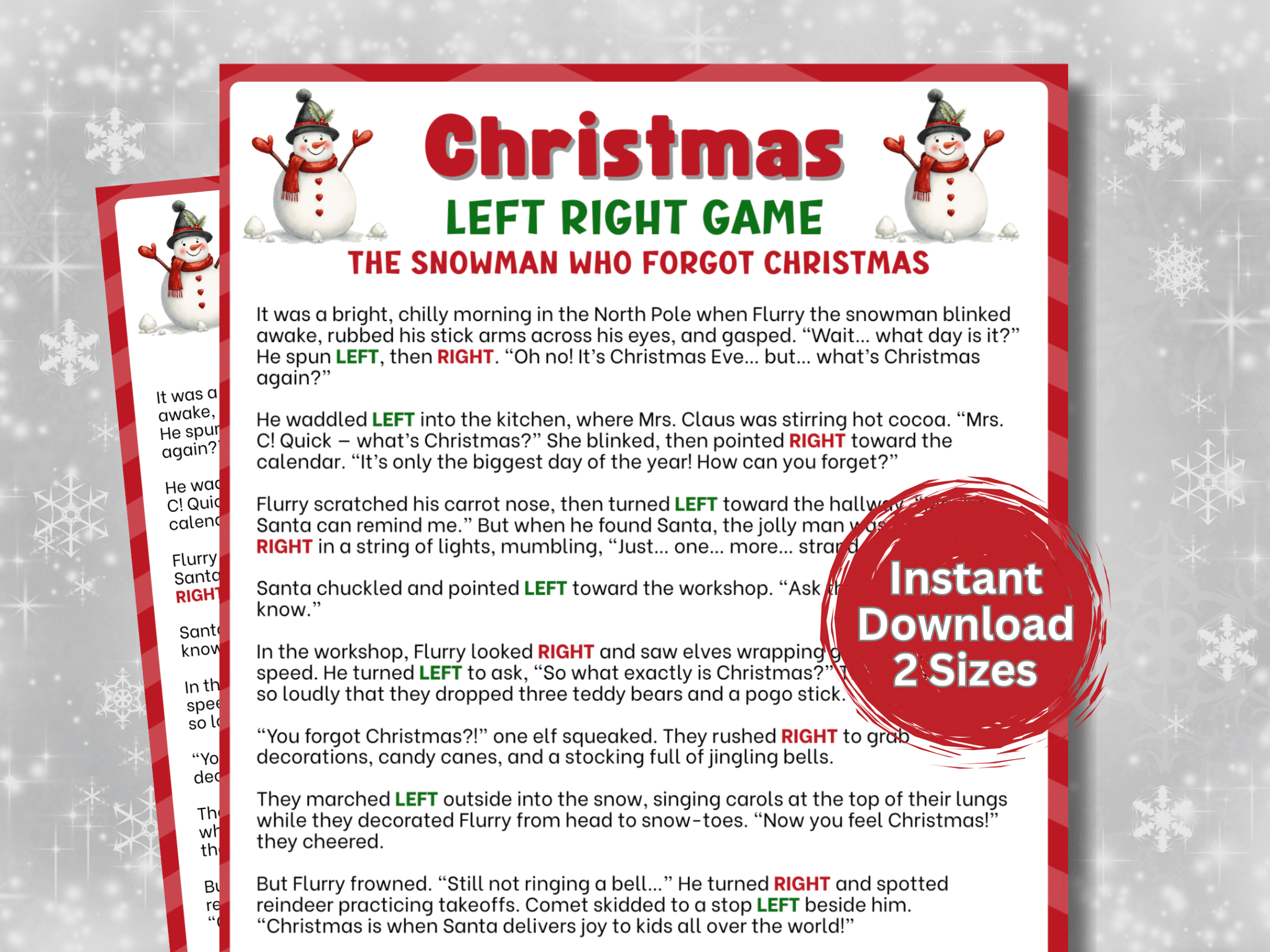 Spice up your holiday gift exchange with this printable Christmas Left Right Game! Read the story aloud and pass gifts left or right each time you hear the words. Perfect for family gatherings, office parties, and Christmas Eve fun!