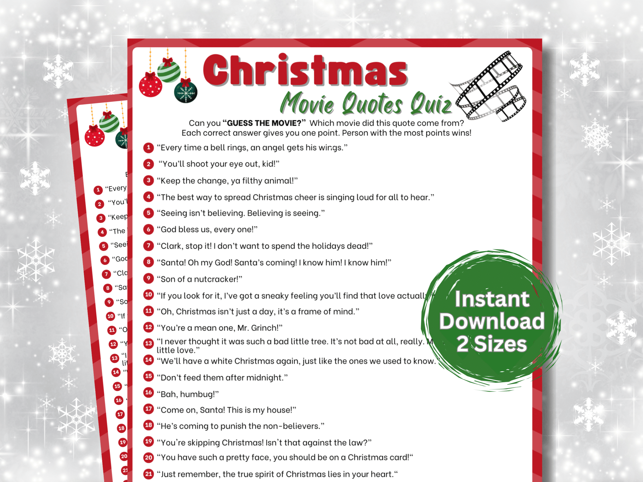 Test your holiday film knowledge with this Christmas Movie Quotes Quiz Printable! Players must match iconic lines to their Christmas movies — perfect for movie lovers and trivia fans. Great for family game night, Christmas parties, office events, and classroom fun.