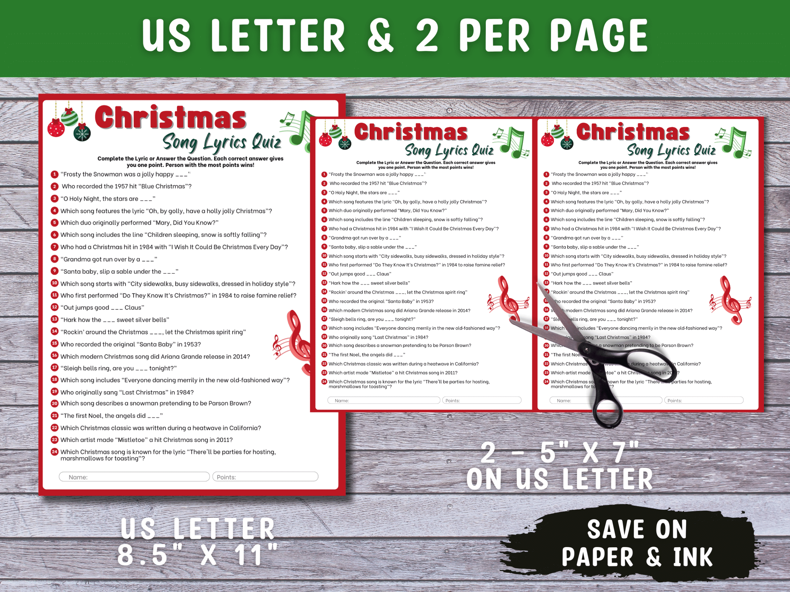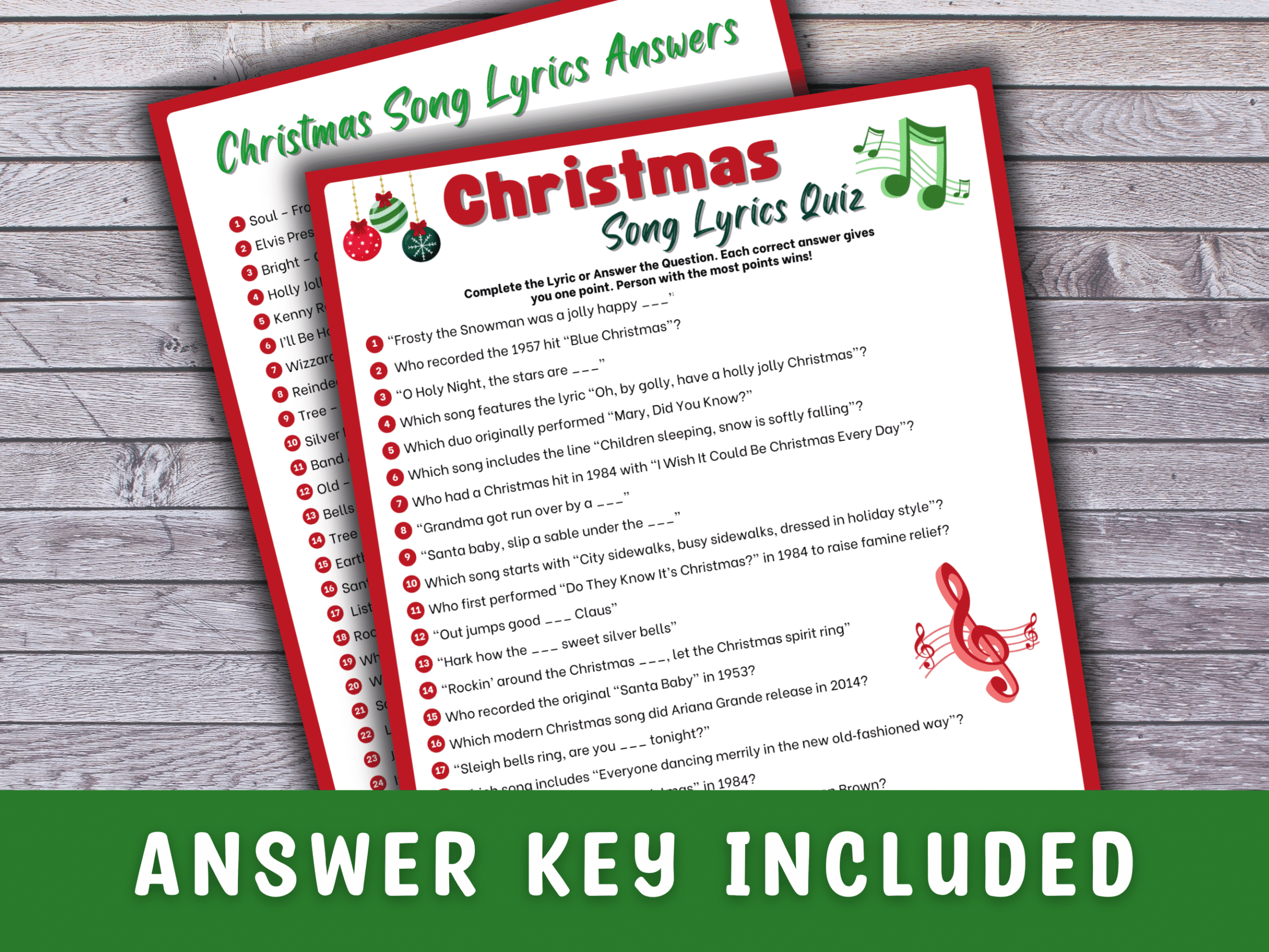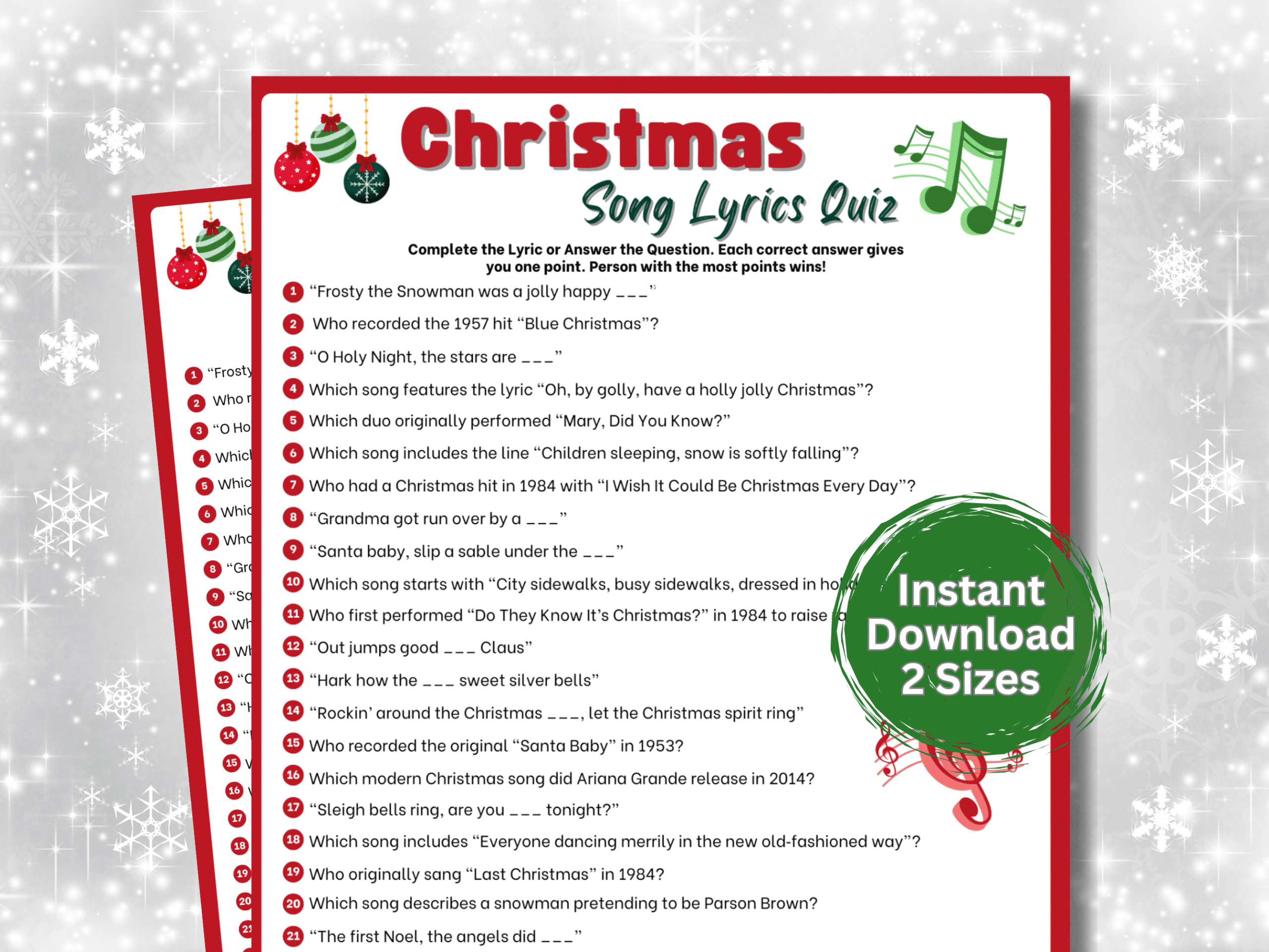 Bring festive cheer with this Christmas Song Lyrics Quiz Printable! Players guess the Christmas song from a line of lyrics. Perfect for adults, teens, families, and groups. A fun and nostalgic activity for Christmas parties, office events, classroom celebrations, and holiday game nights.