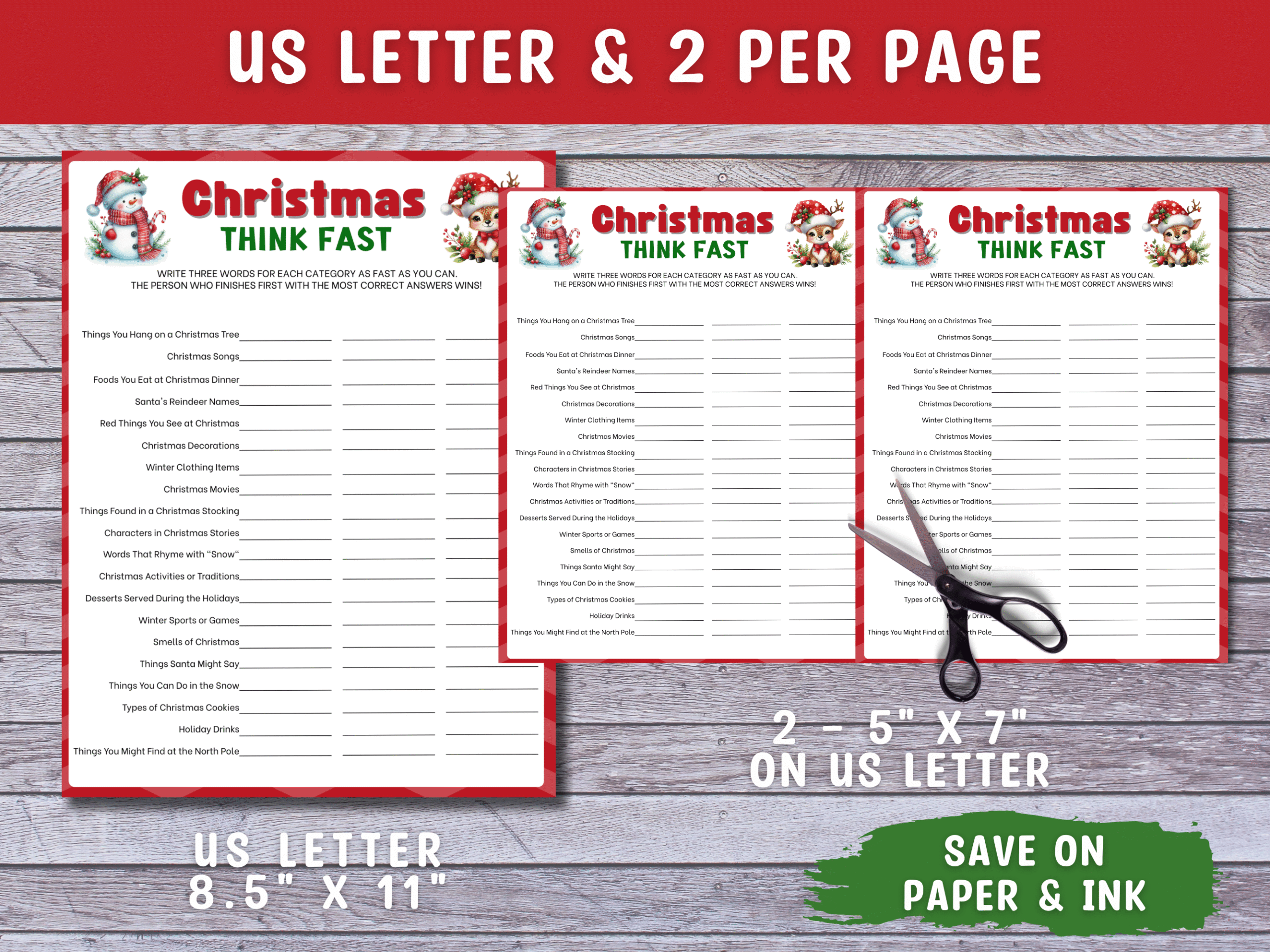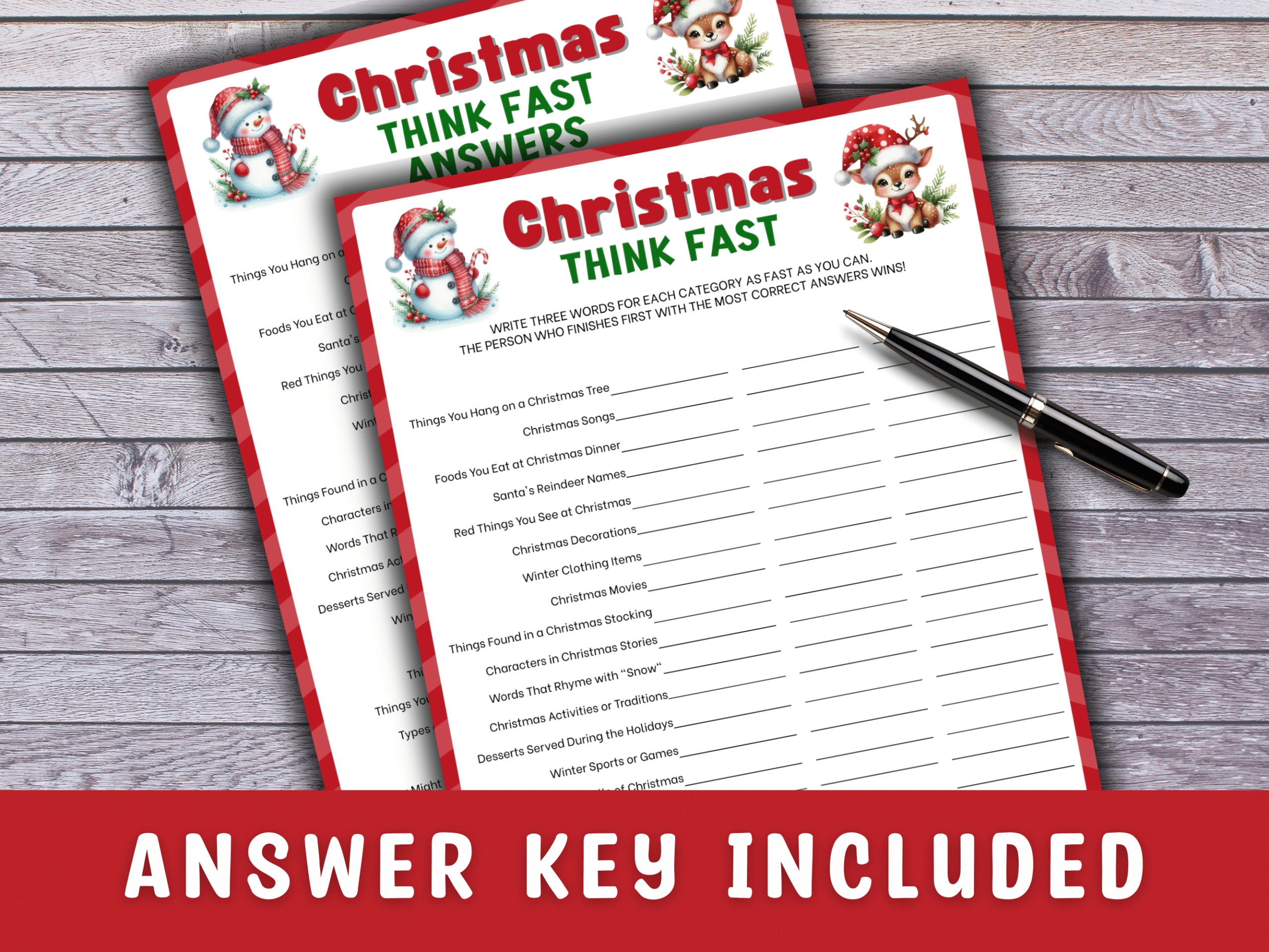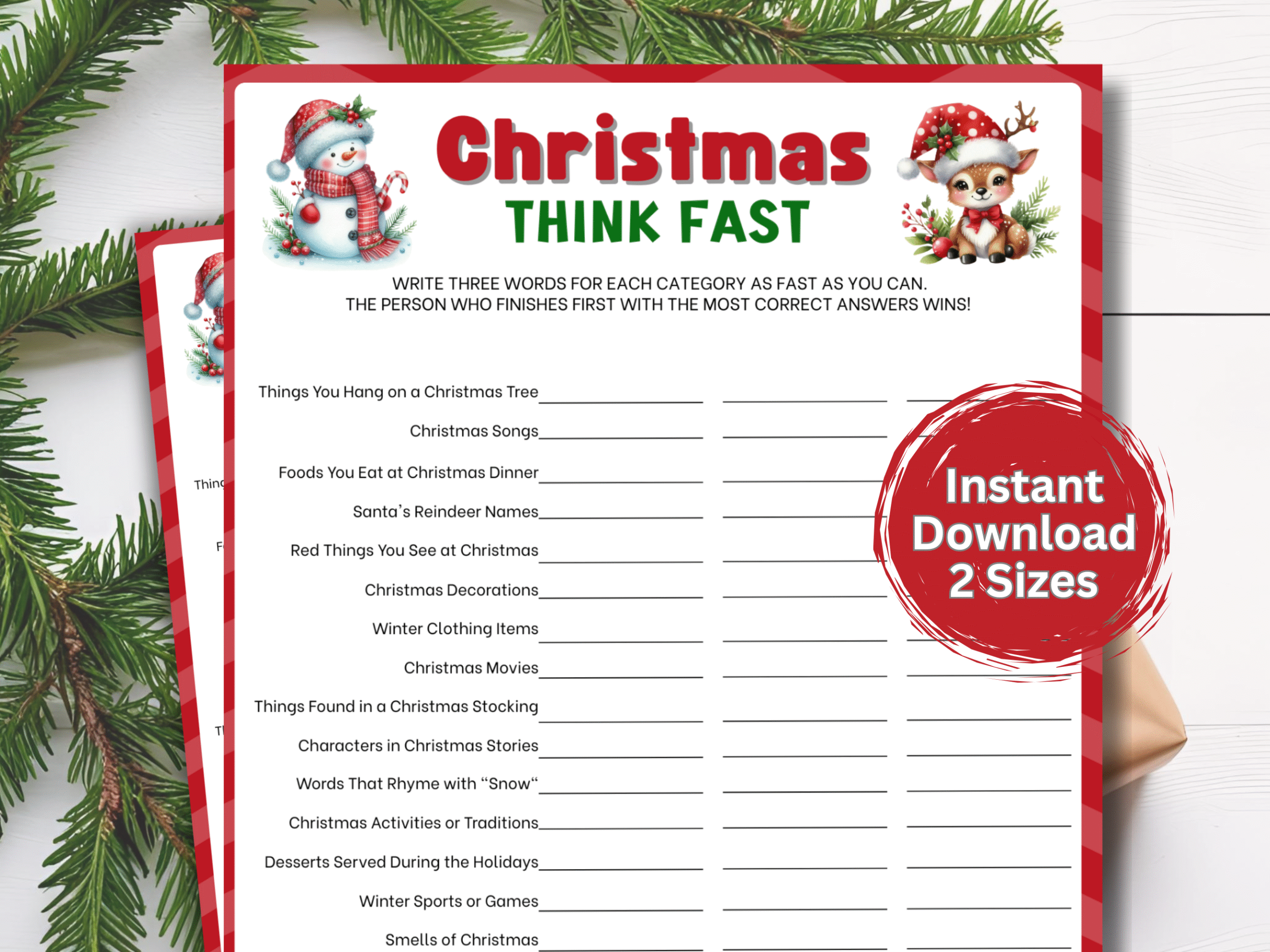 Get ready for fast-paced festive fun! This Christmas Think Fast printable game challenges players to shout out answers before the timer runs out. Perfect for family gatherings, office parties, or Christmas Eve fun. Easy to print and play for all ages!