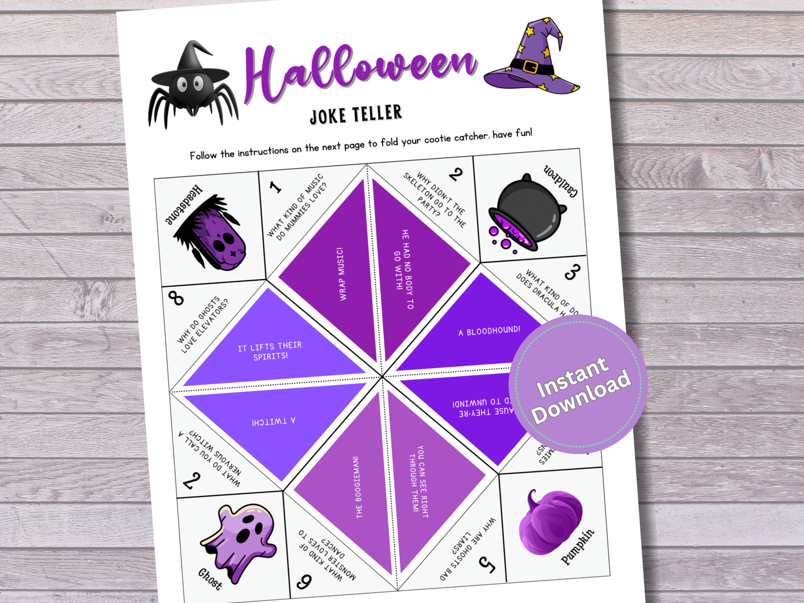 Add spooky fun to Halloween with this purple Halloween Joke Teller! A printable cootie catcher filled with kid-friendly Halloween jokes. Great for classroom parties, trick-or-treat fun, or family game night. Easy to print and fold!
