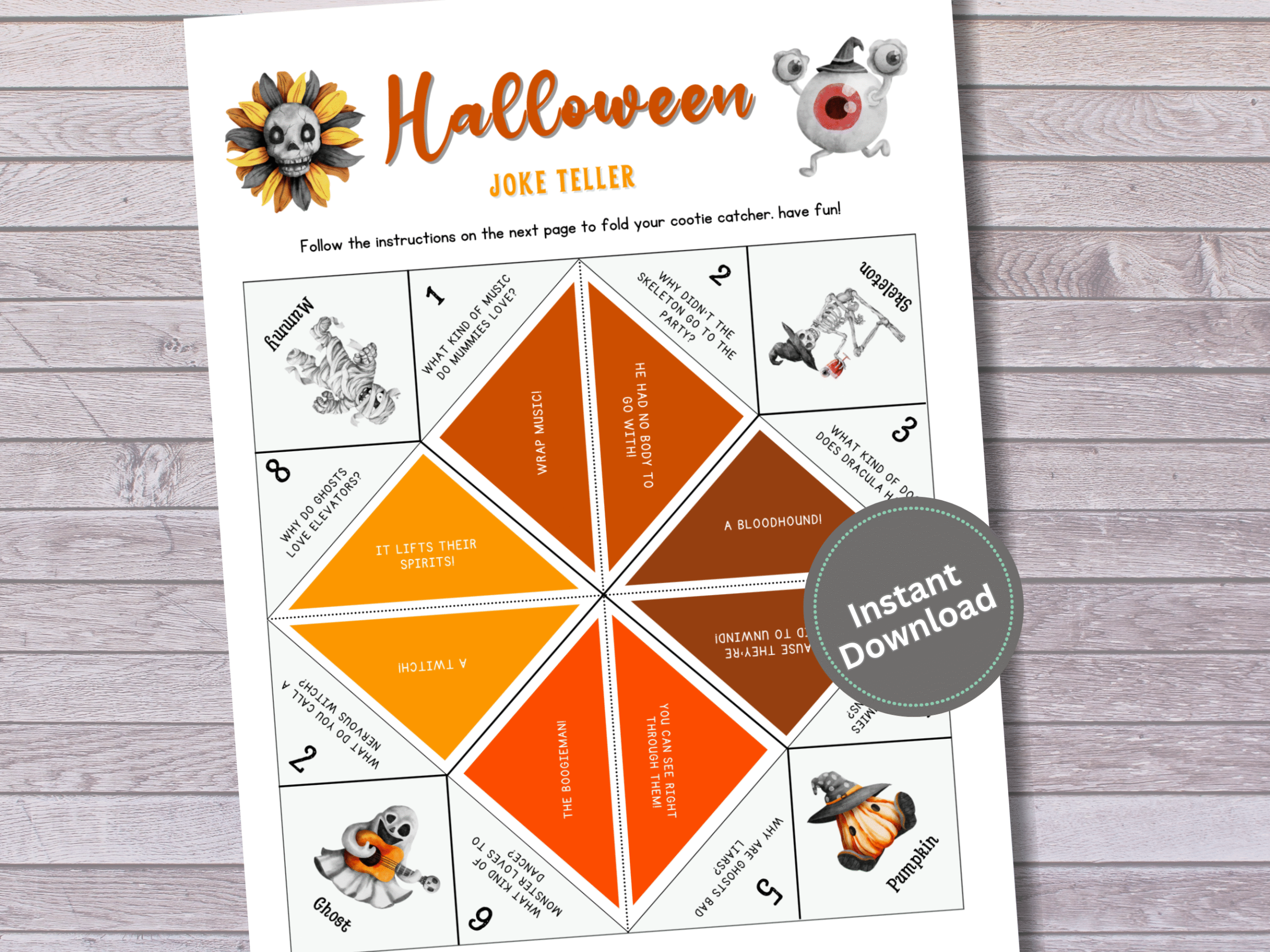 Celebrate Halloween with this printable Fall-themed Joke Teller! Filled with funny and spooky jokes kids will love. Perfect for classroom parties, trick-or-treat fun, or cozy fall evenings. Simple to print, fold, and play!