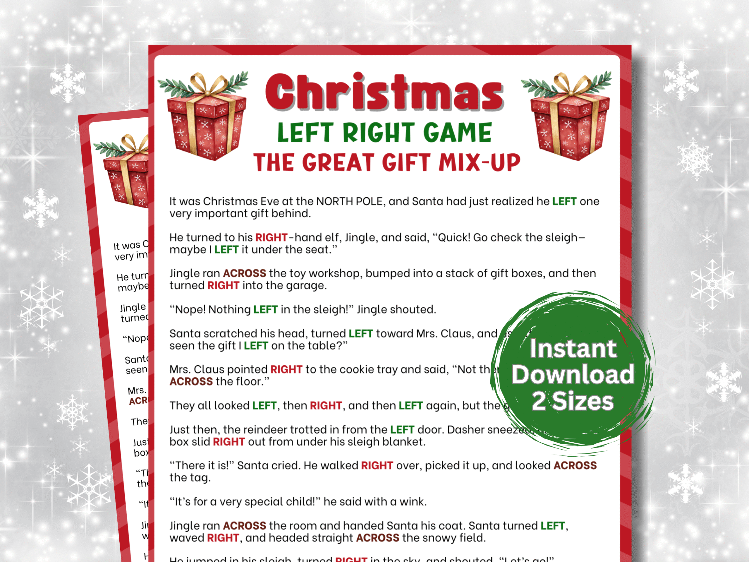 Make your gift exchange unforgettable with The Great Gift Mix-Up Left Right Game! This hilarious Christmas story keeps everyone laughing as gifts move left and right. Ideal for families, coworkers, classrooms, and holiday game nights.