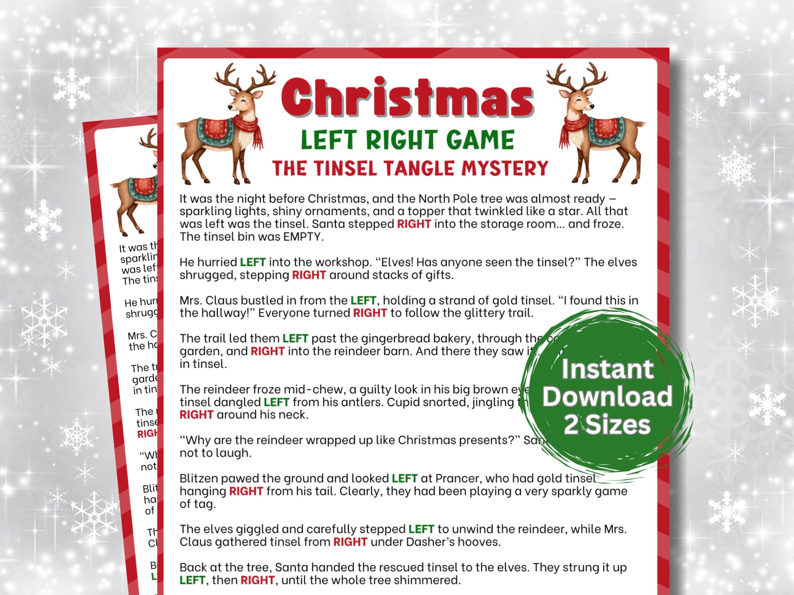 Untangle the holiday chaos with The Tinsel Tangle Mystery Left Right Game! This entertaining Christmas story has guests passing gifts left and right with every twist and turn. Last person with the gift gets to keep it….Yippee! Perfect for families, coworkers, and festive gatherings.